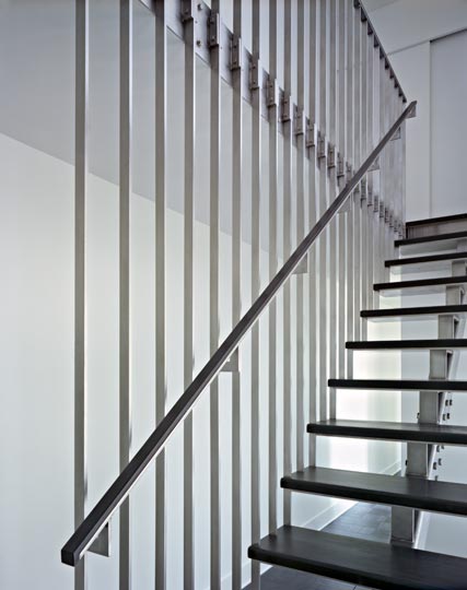 The design emphasizes the verticality through the use of continuous stainless steel bars that rise from the stair treads, in the same dark walnut as the floor, to form the banisters of the railing above. As a backdrop and to allow the natural light to penetrate and back-light the stairs, a continuous wall of Lexan panels carries through both floors.