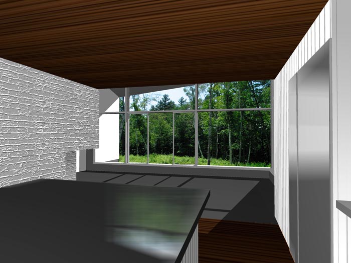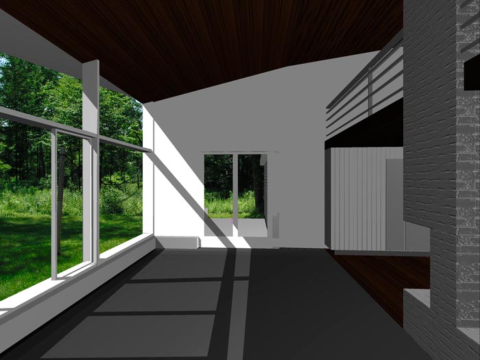 The existing house, a 1970's weekend cabin, was a simple one story wood frame building. Inside, a continuous 8 foot high ceiling felt claustrophobic and oppressive. By replacing the trusses over the central areas with new and more responsive roof trusses, a second story loft could be introduced and the overall space opened up to the landscape and natural light. As with all our projects, a passive solar system is introduced to allow the sun to warm the floor in the winter and shade in the summer.